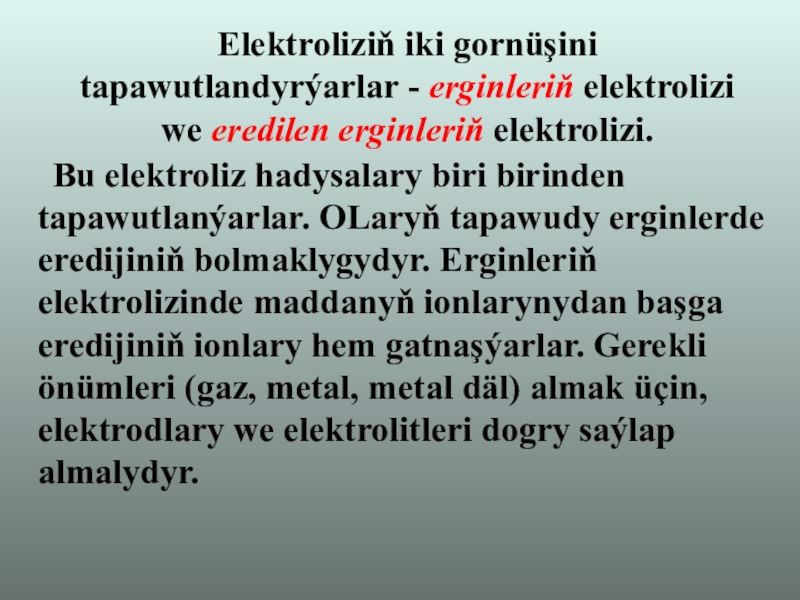 Слайд 2Elektroliz - elektrolitleriň gyzdyrylyp, eredilen erginleriniň üstünden hemişelik elektrik togy göýberlende