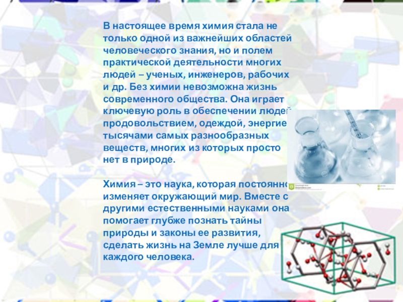 человеческого знания, но и полем практической деятельности многих людей – ученых, инженеров, рабочих и др. Без химии невозможна жизнь современного общества. Она играет ключевую роль в обеспечении людей продовольствием, одеждой, энергией, тысячами самых разнообразных веществ, многих из которых просто нет в природе.