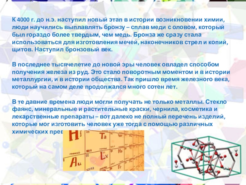 В те давние времена люди могли получать не только металлы. Стекло фаянс, минеральные и растительные краски, чернила, косметика и лекарственные препараты – вот далеко не полный перечень изделий, которые мог изготовить человек уже тогда с помощью различных химических превращений.