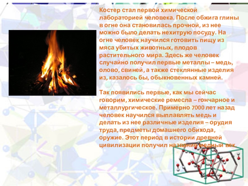 Слайд 3Костер стал первой химической лабораторией человека. После обжига глины в огне
