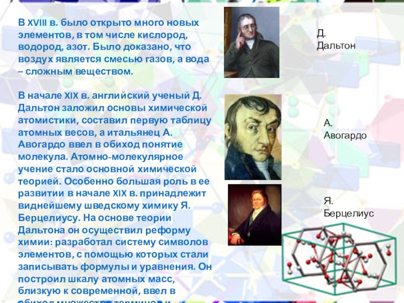 В начале XIX в. английский ученый Д. Дальтон заложил основы химической атомистики, составил первую таблицу атомных весов, а итальянец А. Авогардо ввел в обиход понятие молекула. Атомно-молекулярное учение стало основной химической теорией. Особенно большая роль в ее развитии в начале XIX в. принадлежит виднейшему шведскому химику Я. Берцелиусу. На основе теории Дальтона он осуществил реформу химии: разработал систему символов элементов, с помощью которых стали записывать формулы и уравнения. Он построил шкалу атомных масс, близкую к современной, ввел в обиход множество терминов и понятий, которые мы используем и сейчас.