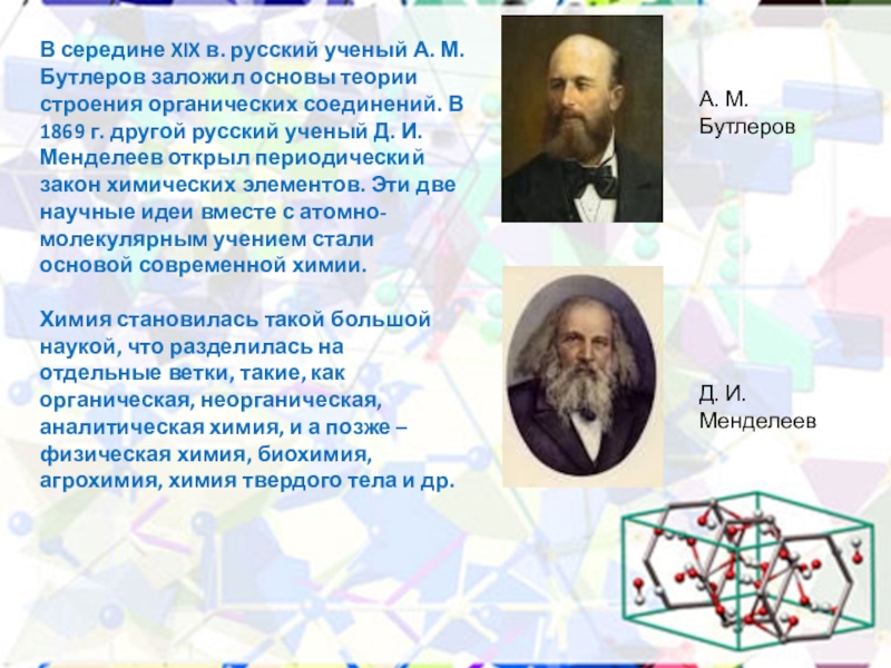 теории строения органических соединений. В 1869 г. другой русский ученый Д. И. Менделеев открыл периодический закон химических элементов. Эти две научные идеи вместе с атомно-молекулярным учением стали основой современной химии.
