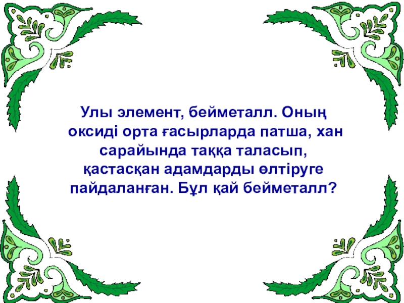 Слайд 26Улы элемент, бейметалл. Оның оксиді орта ғасырларда патша, хан сарайында таққа