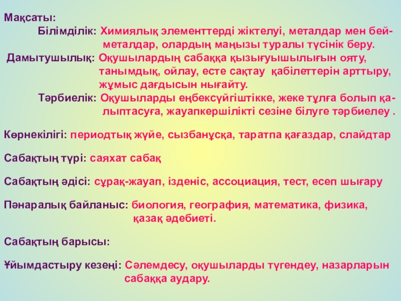 Көрнекілігі: периодтық жүйе, сызбанұсқа, таратпа қағаздар, слайдтар