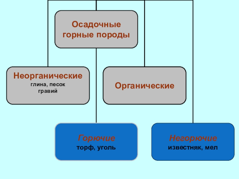 Магматические образуются при остывании и затвердевании магмы. Это, например, гранит . Осадочные горные породы образуются на поверхности земной коры в результате отложения продуктов разрушения на суше и дне водоемов ,а так же путем отложения отмирающих организмов. Осадочные породы бывают неорганические и органические . Неорганические осадочные породы это обломки различных пород, которые под действием ветра, солнечных лучей измельчаются, дробятся и окатываются. Например, щебень, галька, песок, глина .Органические осадочные горные породы образованы остатками растительных и животных организмов . Они бывают горючие и негорючие. Горючие это нефть, горючие сланцы , каменный уголь, торф. Негорючие – мел , известняк.