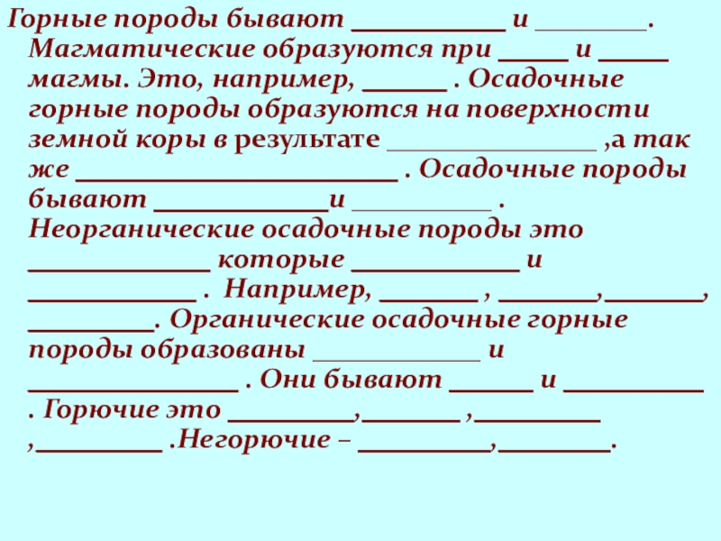 Магматические образуются при _____ и _____ магмы. Это, например, ______ . Осадочные горные породы образуются на поверхности земной коры в результате _______________ ,а так же _______________________ . Осадочные породы бывают ____________ и __________ . Неорганические осадочные породы это _____________ которые ____________ и ____________ . Например, _______ , _______,_______, _________. Органические осадочные горные породы образованы ____________ и _______________ . Они бывают ______ и __________ . Горючие это _________,_______ ,_________ ,_________ .Негорючие – _________,________.