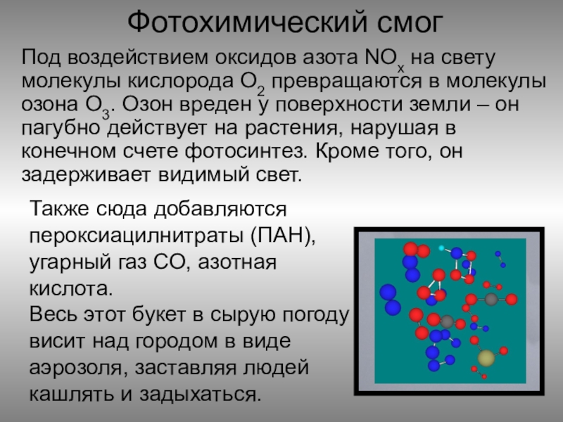 Также сюда добавляются пероксиацилнитраты (ПАН), угарный газ СО, азотная кислота.