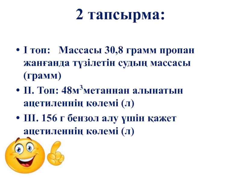 2 тапсырма: І топ:  Массасы 30,8 грамм пропан жанғанда түзілетін судың массасы (грамм)ІІ. Топ: 48м3метаннан алынатын
