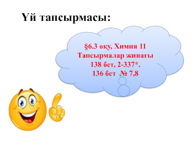Үй тапсырмасы:§6.3 оқу, Химия 11 Тапсырмалар жинағы 138 бет, 2-337*.136 бет № 7,8