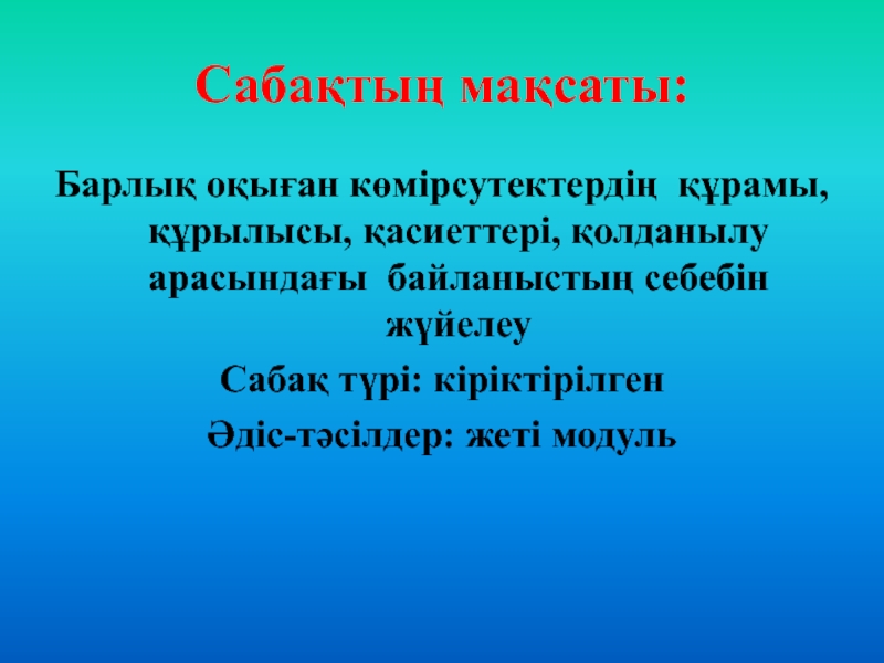 Сабақтың мақсаты:Барлық оқыған көмірсутектердің құрамы, құрылысы, қасиеттері, қолданылу арасындағы байланыстың себебін жүйелеуСабақ түрі: кіріктірілгенӘдіс-тәсілдер: жеті модуль