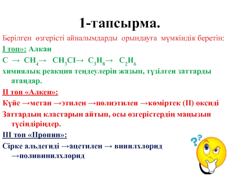 1-тапсырма.Берілген өзгерісті айналымдарды орындауға мүмкіндік беретін:І топ»: АлканС → СН4→  СН3СІ→ С3Н8→  С2Н6химиялық реакция теңдеулерін