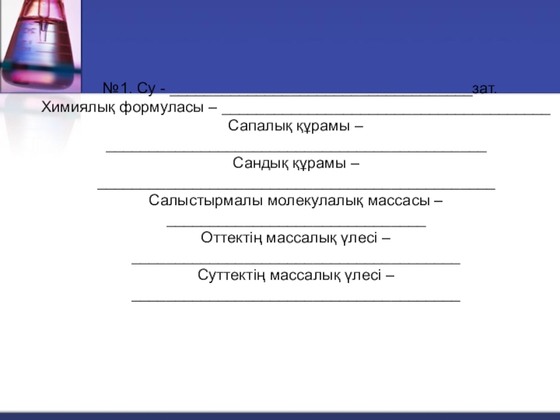 №1. Су - ___________________________________зат.Химиялық формуласы – ______________________________________Сапалық құрамы – ____________________________________________Сандық құрамы – ______________________________________________Салыстырмалы молекулалық массасы –