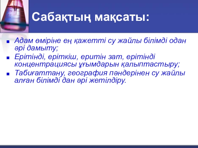 Сабақтың мақсаты:Адам өміріне ең қажетті су жайлы білімді одан әрі дамыту;Ерітінді, еріткіш, еритін зат, ерітінді концентрациясы ұғымдарын қалыптастыру;Табиғаттану, география пәндерінен су жайлы алған білімді дан әрі жетілдіру.