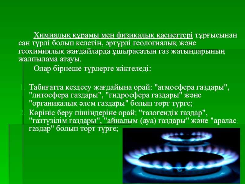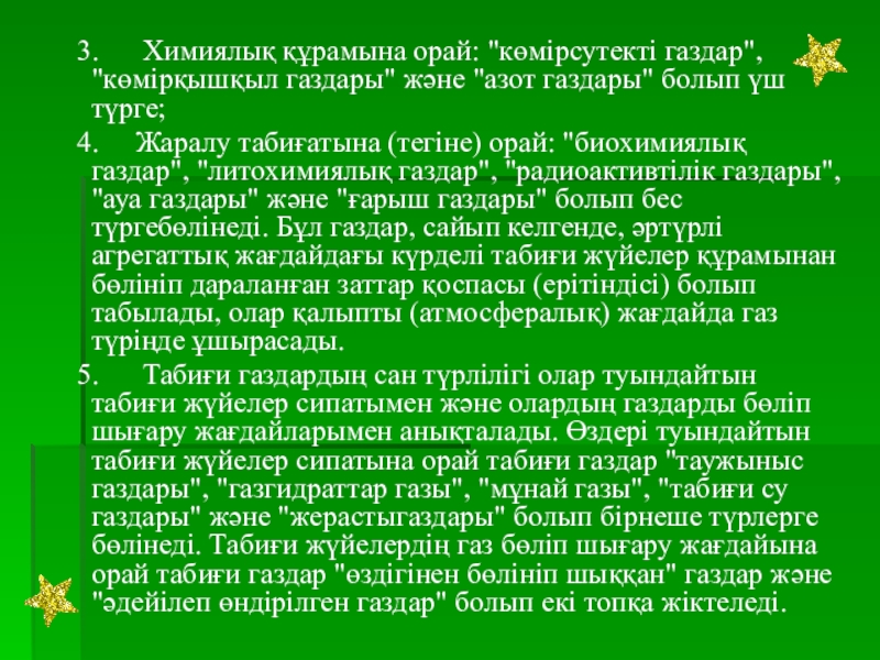 3. Химиялық құрамына орай: "көмірсутекті газдар", "көмірқышқыл газдары" және