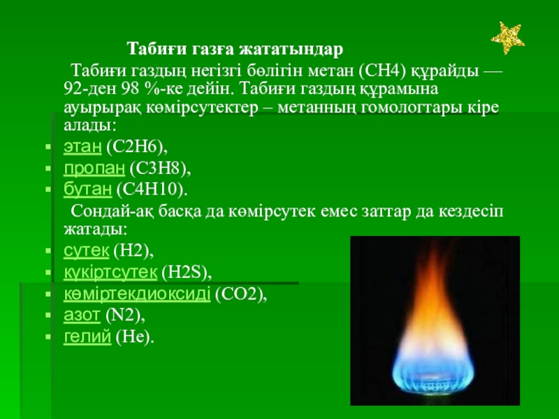98 %-ке дейін. Табиғи газдың құрамына ауырырақ көмірсутектер – метанның гомологтары кіре алады: