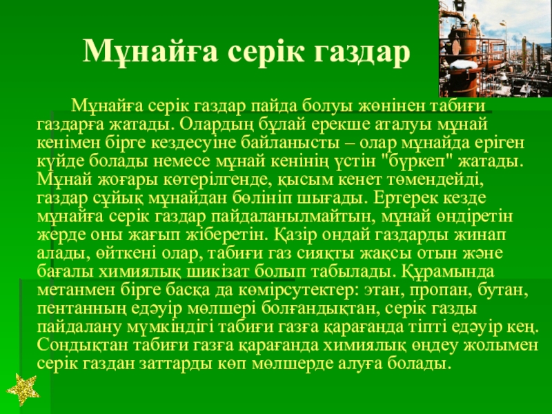 Мұнайға серік газдар пайда болуы жөнінен табиғи газдарға жатады.