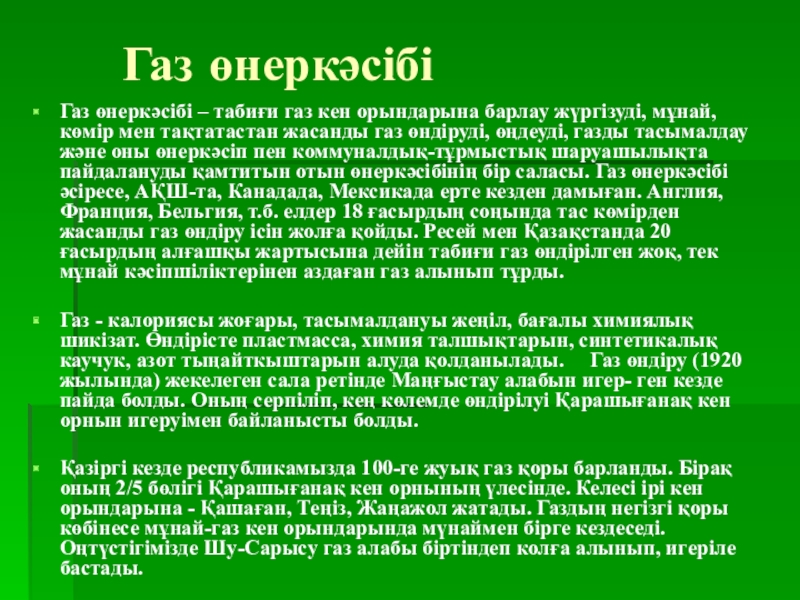 Газ - калориясы жоғары, тасымалдануы жеңіл, бағалы химиялық шикізат. Өндірісте пластмасса, химия талшықтарын, синтетикалық каучук, азот тыңайткыштарын алуда қолданылады. Газ өндіру (1920 жылында) жекелеген сала ретінде Маңғыстау алабын игер- ген кезде пайда болды. Оның серпіліп, кең көлемде өндірілуі Қарашығанақ кен орнын игеруімен байланысты болды.
