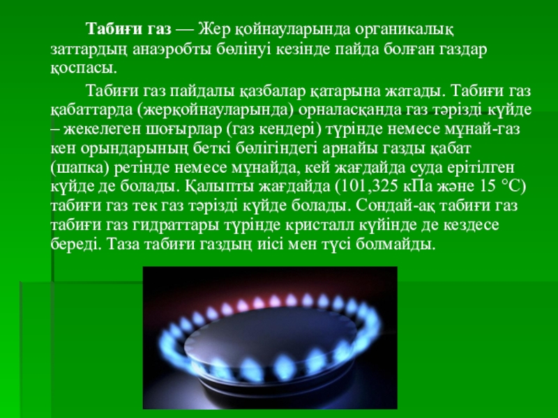 Слайд 2 Табиғи газ — Жер қойнауларында органикалық заттардың анаэробты бөлінуі кезінде пайда