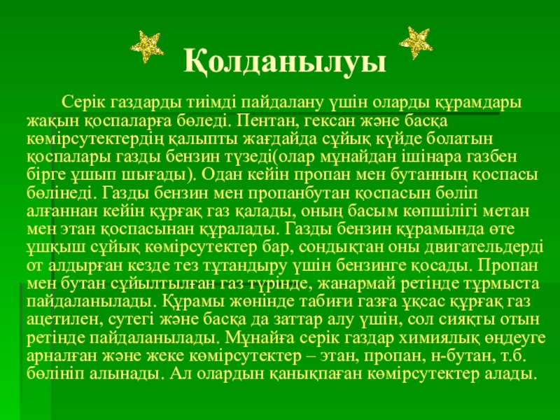 гексан және басқа көмірсутектердің қалыпты жағдайда сұйық күйде болатын қоспалары газды бензин түзеді(олар мұнайдан ішінара газбен бірге ұшып шығады). Одан кейін пропан мен бутанның қоспасы бөлінеді. Газды бензин мен пропанбутан қоспасын бөліп алғаннан кейін құрғақ газ қалады, оның басым көпшілігі метан мен этан қоспасынан құралады. Газды бензин құрамында өте ұшқыш сұйық көмірсутектер бар, сондықтан оны двигательдерді от алдырған кезде тез тұтандыру үшін бензинге қосады. Пропан мен бутан сұйылтылған газ түрінде, жанармай ретінде тұрмыста пайдаланылады. Құрамы жөнінде табиғи газға ұқсас құрғақ газ ацетилен, сутегі және басқа да заттар алу үшін, сол сияқты отын ретінде пайдаланылады. Мұнайға серік газдар химиялық өңдеуге арналған және жеке көмірсутектер – этан, пропан, н-бутан, т.б. бөлініп алынады. Ал олардын қанықпаған көмірсутектер алады.