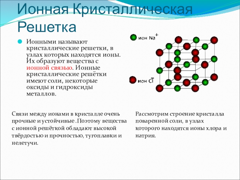 Связи между ионами в кристалле очень прочные и устойчивые .Поэтому вещества с ионной решёткой обладают высокой твёрдостью и прочностью, тугоплавки и нелетучи.