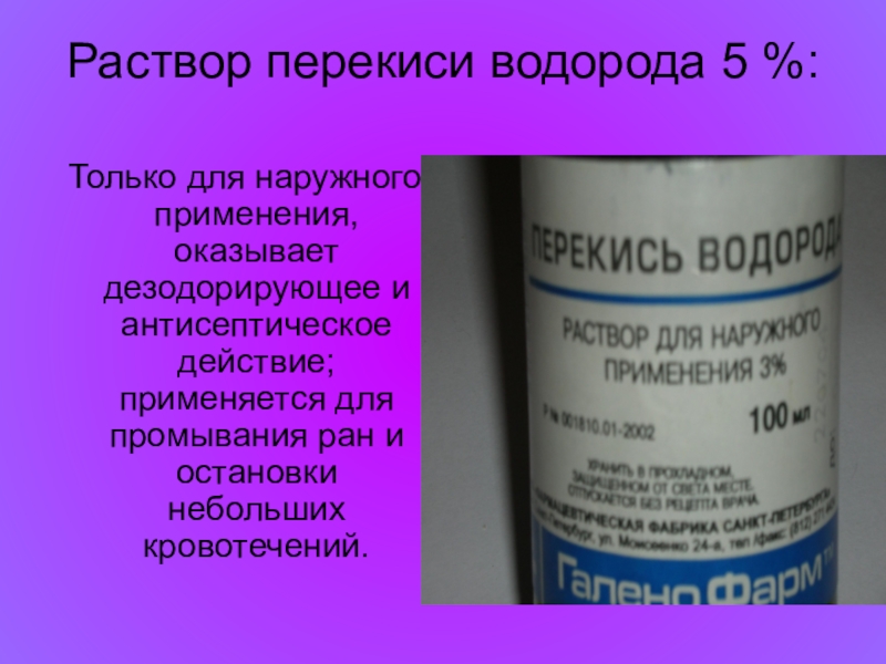 и антисептическое действие; применяется для промывания ран и остановки небольших кровотечений.