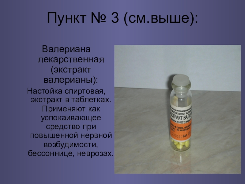 Раствор и таблетки. Успокаивающее средство, применяют при раздражительности, тревоге,