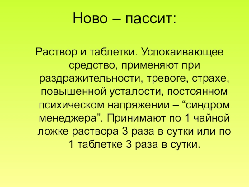 страхе, повышенной усталости, постоянном психическом напряжении – “синдром менеджера”. Принимают по 1 чайной ложке раствора 3 раза в сутки или по 1 таблетке 3 раза в сутки.