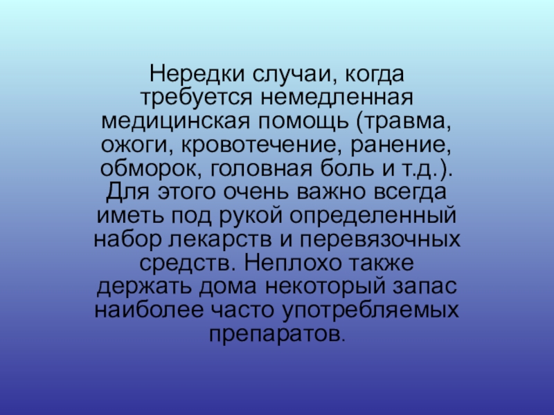 Слайд 2Нередки случаи, когда требуется немедленная медицинская помощь (травма, ожоги, кровотечение, ранение,