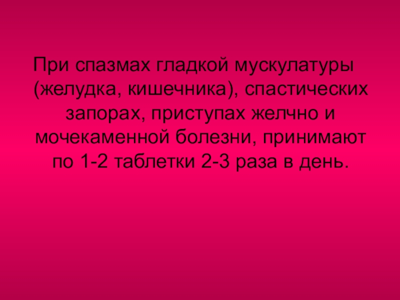 Слайд 14При спазмах гладкой мускулатуры (желудка, кишечника), спастических запорах, приступах желчно и
