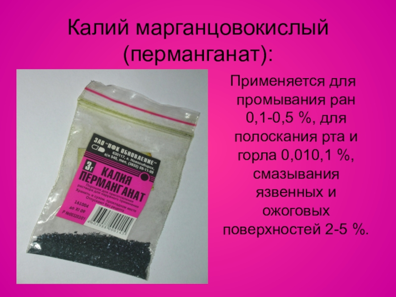 рта и горла 0,010,1 %, смазывания язвенных и ожоговых поверхностей 2-5 %.