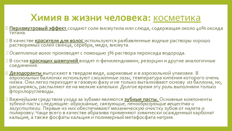 В повседневной жизни человека химия нашла отражение прежде всего в различных предметах бытовой химии (моющие и дезинфицирующие средства, средства по уходу за мебелью, стеклянными и зеркальными поверхностями и т.д.), лекарственных препаратах, косметических средствах, различных изделиях из пластмасс, красках, клеях, средствах для борьбы с насекомыми, удобрениями и т.д. Этот список можно продолжать практически бесконечно, рассмотрим лишь некоторые его пункты.