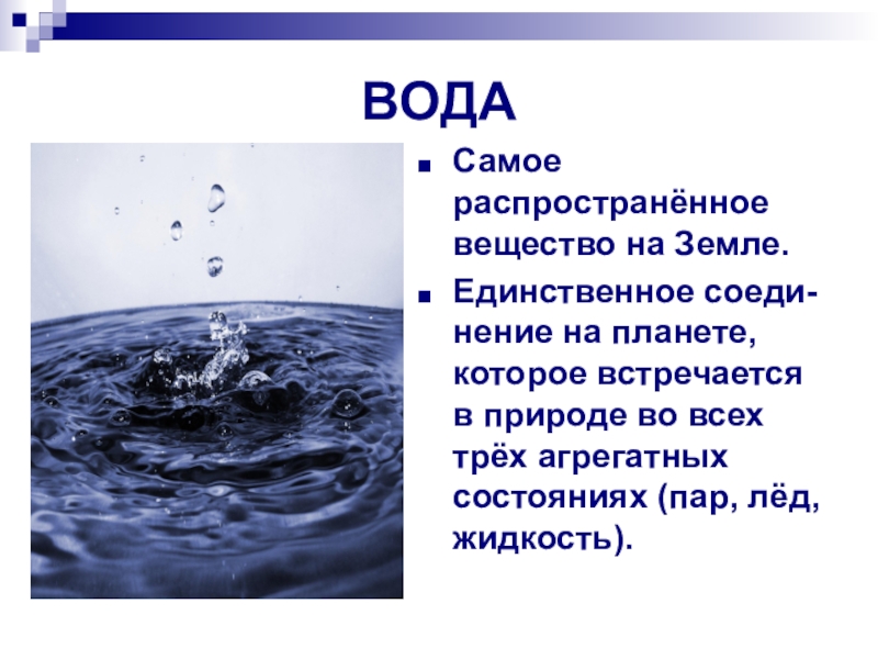 природе во всех трёх агрегатных состояниях (пар, лёд, жидкость).