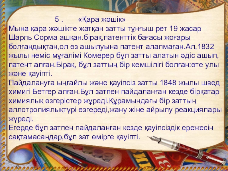 Пайдалануға ыңғайлы және қауіпсіз затты 1848 жылы швед химигі Бетгер алған.Бұл затпен пайдаланған кезде бірқатар химиялық өзгерістер жұреді.Құрамындағы бір заттың аллотропиялықтүрі өзгереді,жану жіне айрылу реакциялары жүреді.