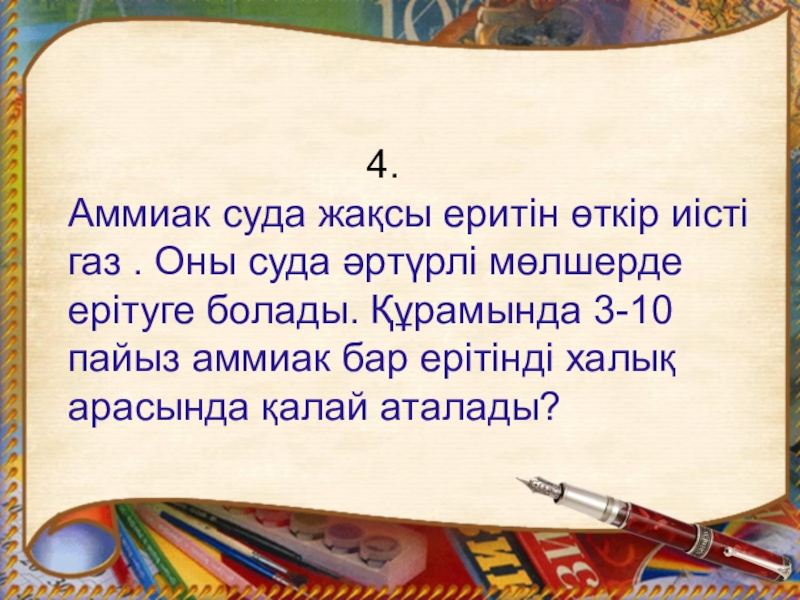 Аммиак суда жақсы еритін өткір иісті газ . Оны суда әртүрлі мөлшерде ерітуге болады. Құрамында 3-10 пайыз аммиак бар ерітінді халық арасында қалай аталады?
