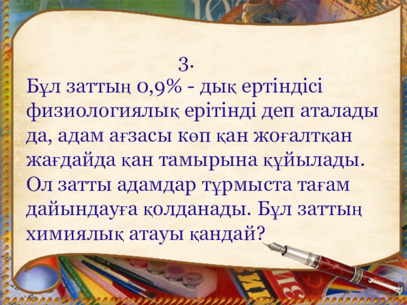 Бұл заттың 0,9% - дық ертіндісі физиологиялық ерітінді деп аталады да, адам ағзасы көп қан жоғалтқан жағдайда қан тамырына құйылады. Ол затты адамдар тұрмыста тағам дайындауға қолданады. Бұл заттың химиялық атауы қандай?