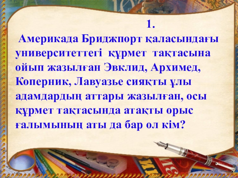 Америкада Бриджпорт қаласындағы университеттегі құрмет тақтасына ойып жазылған Эвклид, Архимед, Коперник, Лавуазье сияқты ұлы адамдардың аттары жазылған, осы құрмет тақтасында атақты орыс ғалымының аты да бар ол кім?