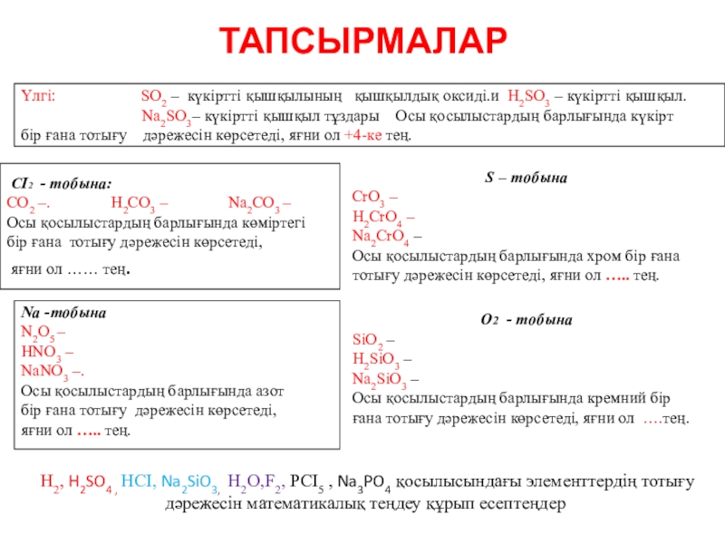 H2, H2SO4 , HCI, Na2SiO3, H2O,F2, PCI5 , Na3PO4 қосылысындағы элементтердің тотығу дәрежесін математикалық теңдеу құрып есептеңдер