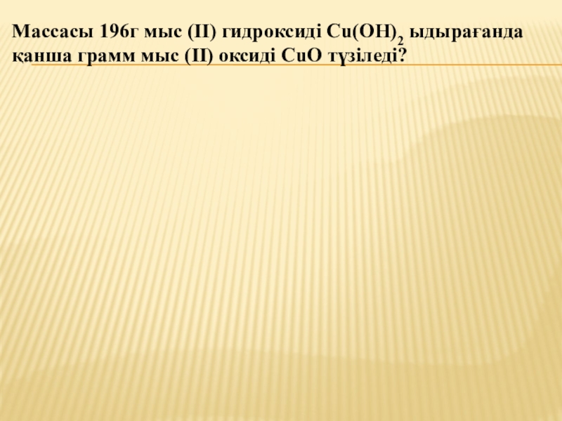 Слайд 7Массасы 196г мыс (II) гидроксиді Cu(OH)2 ыдырағанда қанша грамм мыс (II)