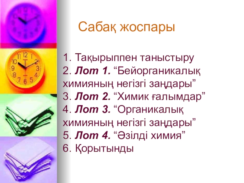 Сабақ жоспары  1. Тақырыппен таныстыру 2. Лот 1. “Бейорганикалық химияның негізгі заңдары” 3. Лот
