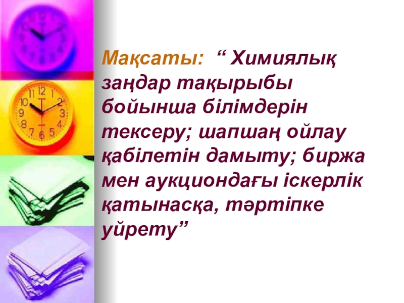 Мақсаты: “ Химиялық заңдар тақырыбы бойынша білімдерін тексеру; шапшаң ойлау қабілетін дамыту; биржа мен аукциондағы іскерлік қатынасқа, тәртіпке уйрету”