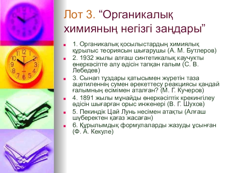 Лот 3. “Органикалық химияның негізгі заңдары”1. Органикалық қосылыстардың химиялық құрылыс теориясын шығарушы (А. М. Бутлеров)2. 1932 жылы