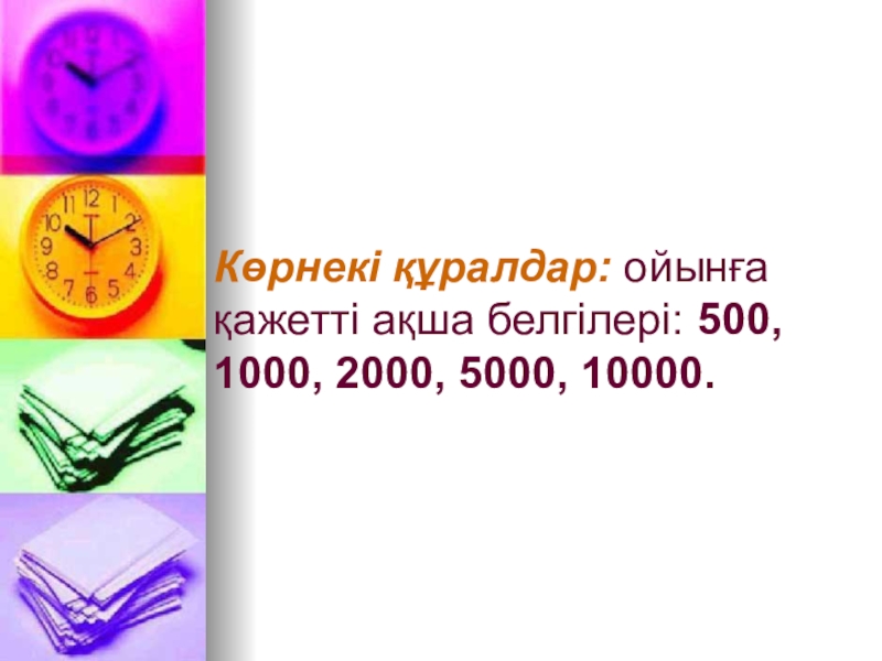 Слайд 4Көрнекі құралдар: ойынға қажетті ақша белгілері: 500, 1000, 2000, 5000, 10000.