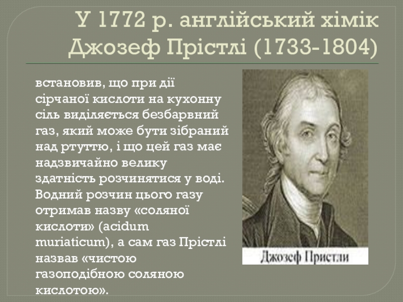 У 1772 р. англійський хімік Джозеф Прістлі (1733-1804) встановив, що при дії сірчаної кислоти на кухонну сіль