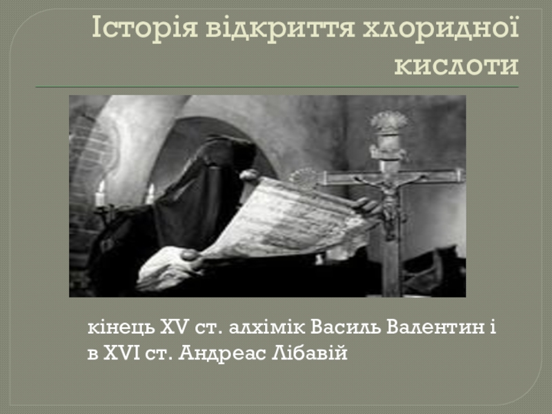 Історія відкриття хлоридної кислотикінець XV ст. алхімік Василь Валентин і в XVI ст. Андреас Лібавій