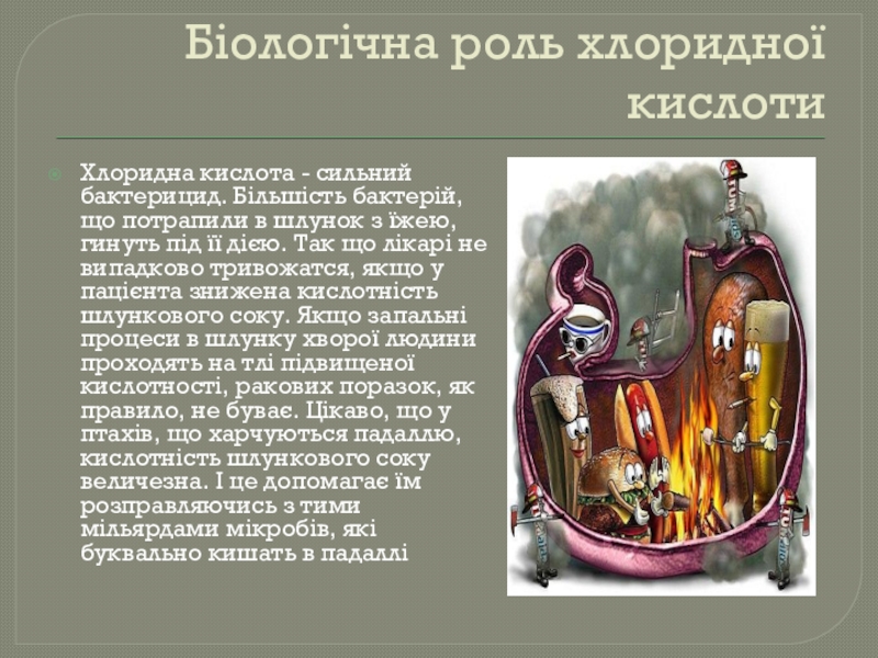 Біологічна роль хлоридної кислотиХлоридна кислота - сильний бактерицид. Більшість бактерій, що потрапили в шлунок з їжею, гинуть