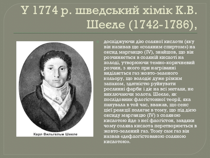 У 1774 р. шведський хімік К.В. Шеєле (1742-1786), досліджуючи дію соляної кислоти (яку він називав ще «соляним