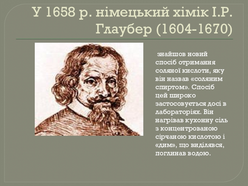 У 1658 р. німецький хімік І.Р. Глаубер (1604-1670) знайшов новий спосіб отримання соляної кислоти, яку він назвав