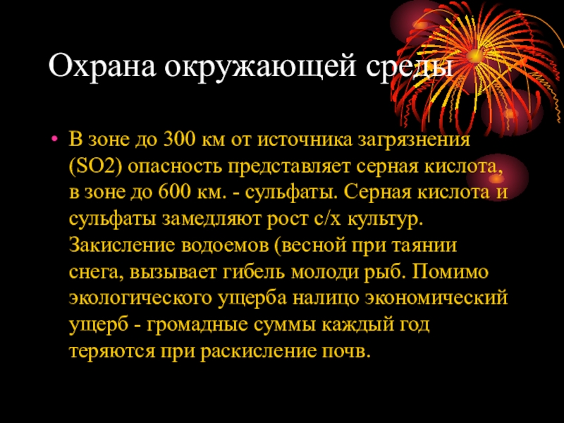 опасность представляет серная кислота, в зоне до 600 км. - сульфаты. Серная кислота и сульфаты замедляют рост с/х культур. Закисление водоемов (весной при таянии снега, вызывает гибель молоди рыб. Помимо экологического ущерба налицо экономический ущерб - громадные суммы каждый год теряются при раскисление почв.