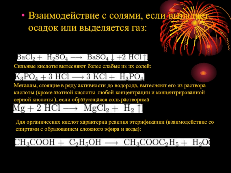 Слайд 13Взаимодействие с солями, если выпадает осадок или выделяется газ: