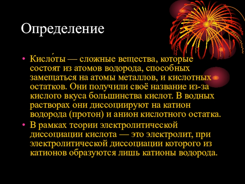на атомы металлов, и кислотных остатков. Они получили своё название из-за кислого вкуса большинства кислот. В водных растворах они диссоциируют на катион водорода (протон) и анион кислотного остатка.
